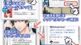 ゲーム序盤の効率的な進め方について紹介します。チュートリアル基本的な操作方法について操作方法はとっても簡単!彼から届いたメッセージをみてお話しするだけ!あなたからのメッセージを読んで、彼が反応を返してくれます。あなたとのやり取りでストーリー...